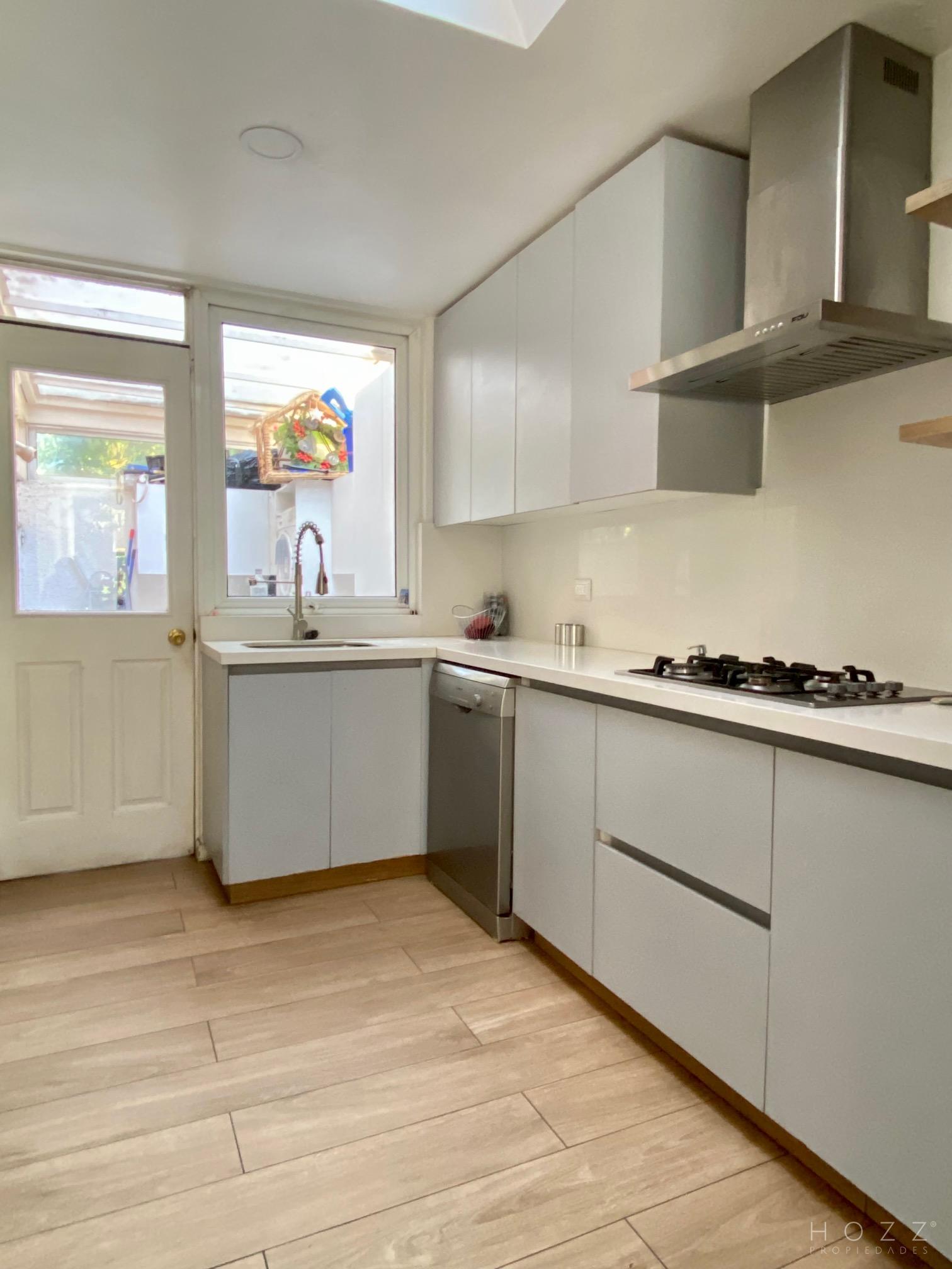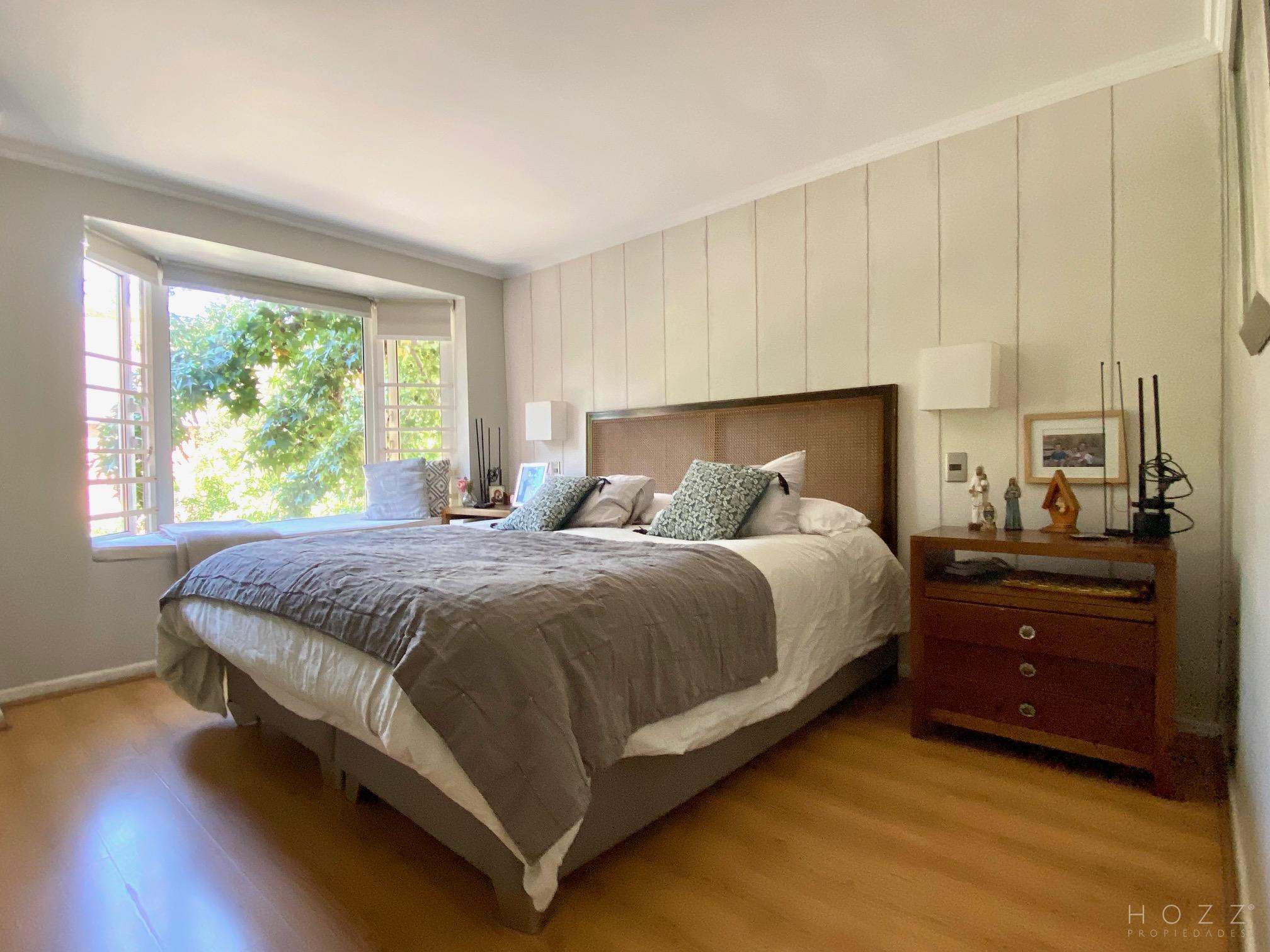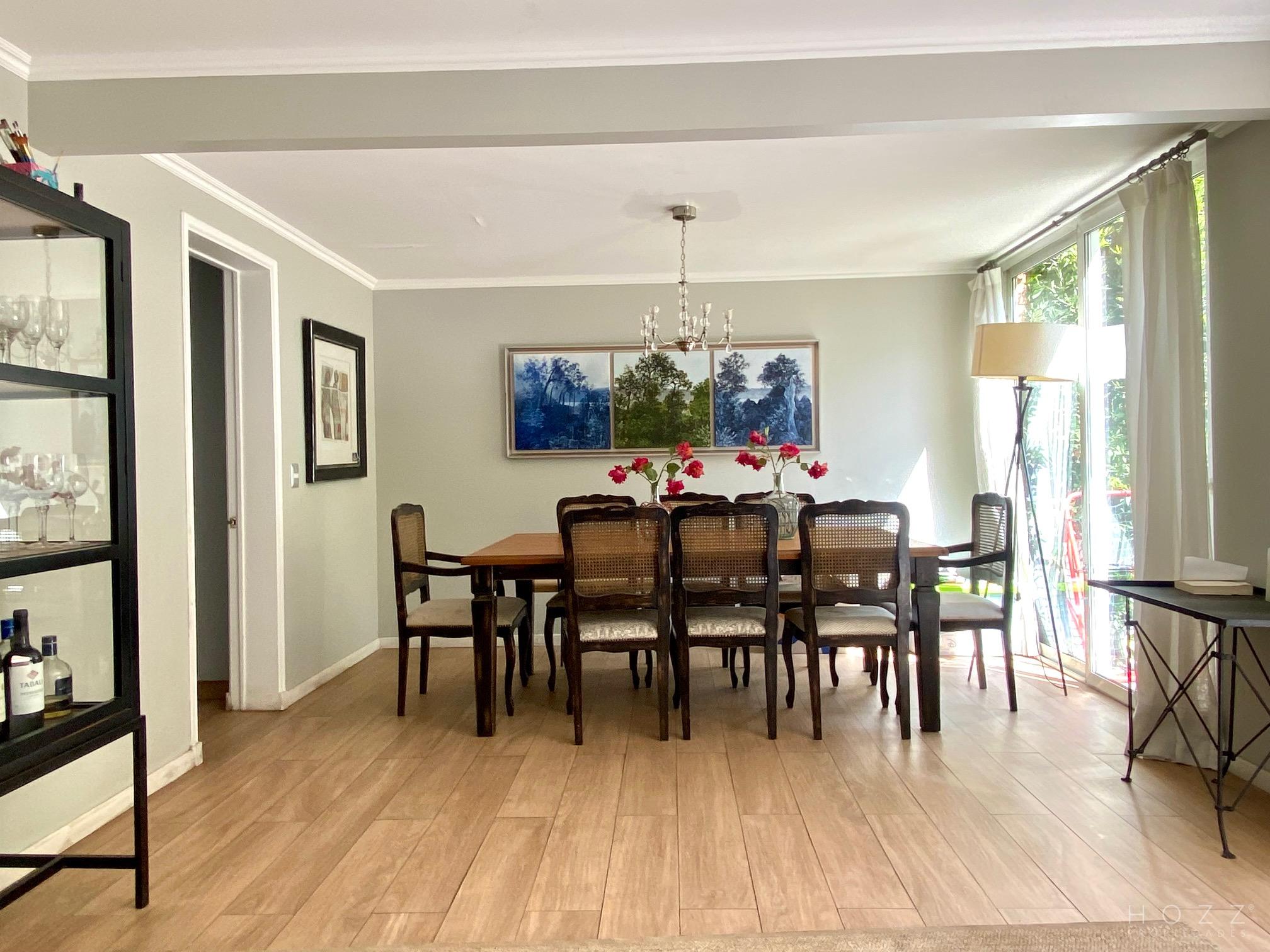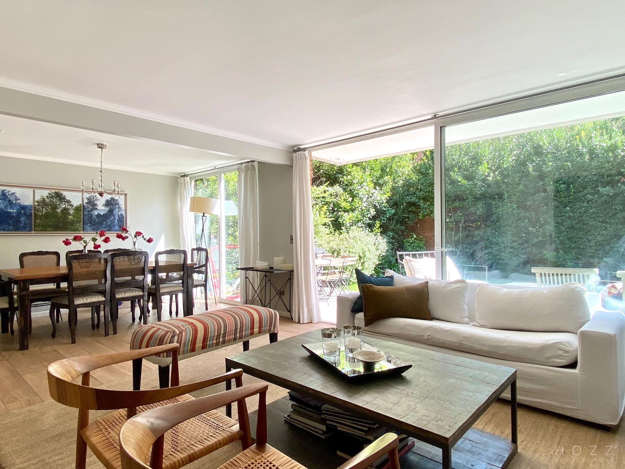 - Hall de entrada - Baño de visita - Cocina remodelada con comedor de diario y logia - Pieza y baño de servicios - Living y comedor luminosos con salida al jardín Segundo piso - Pieza principal en suite - Dos dormitorios que comparten un baño Tercer piso - Sala de estar amplia - Baño completo - Un dormitorio Estacionamiento para dos autos Ventanas termopanel Calefacción por losa radiante Condominio cerrado Gastos comunes 28.000 Contribuciones 380.000 la cuota